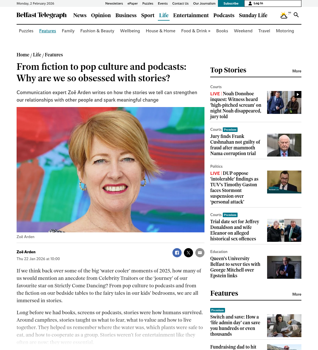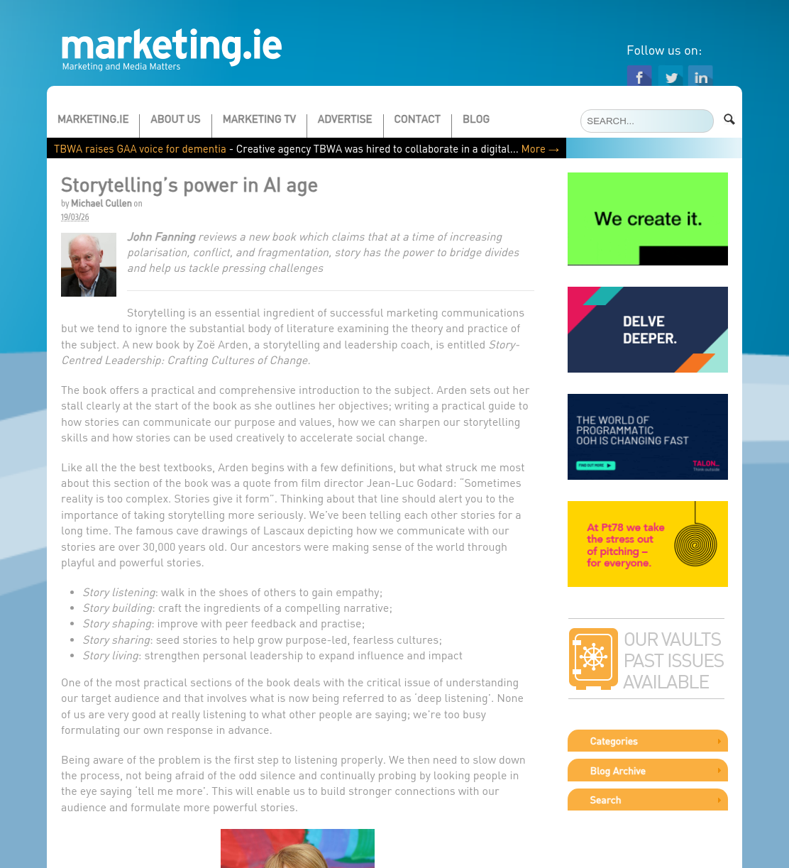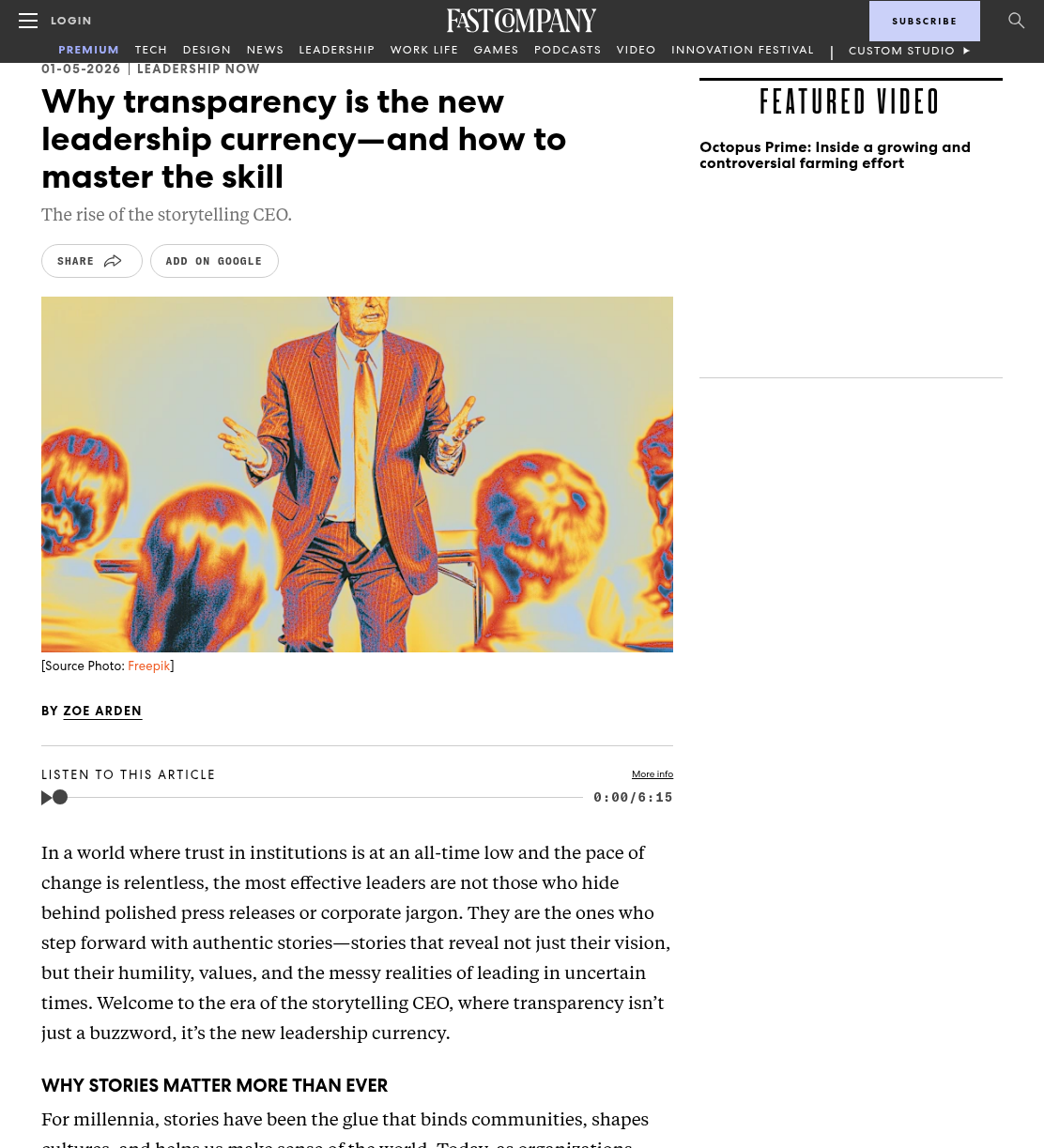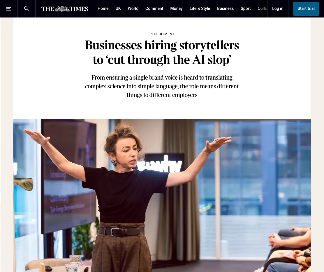 Media Conversations and coverage Must-reads for women in tech: March book round-upShe can code How storytelling can help drive action towards a sustainable futureBusinessGreen Why Hearing Different Voices in Our Business Stories Matters More Than EverCEOWORLD Magazine Crafting culture of change with guest Zoë ArdenROI of DEI From fiction to pop culture and podcasts: Why are we so obsessed with stories?Belfast Telegraph In an A.I.-Driven World, Storytelling Is Becoming Leadership’s Most Critical SkillObserver Storytelling’s power in AI ageMarketing.ie Story-Centred Leadership by Zoë ArdenEliteBusiness Sustainability superheroes: simply avoiding the echo chamberPR Moment Story-Centred Leadership with Zoë ArdenThe Extraordinary Business Book Club Businesses hiring storytellers to ‘cut through the AI slop’The Times Why transparency is the new leadership currency—and how to master the skillFast Company Why Story Is Becoming A Core Skill For Modern LeadersSustainable Business Magazine Don’t Become A Political Referee: How To Lead A Polarized TeamForbes Can you still say ‘climate’? How to shape effective sustainability stories in 2026edie How to Use Storytelling to Retain and Engage Top TalentThe European Business Review Storytelling – the essential skill every HR professional needsHR News Story-Centred Leadership: Crafting Cultures of ChangeNewstalk 5 Leadership Storytelling Insights That Drive Real Behavior ChangeHR Future